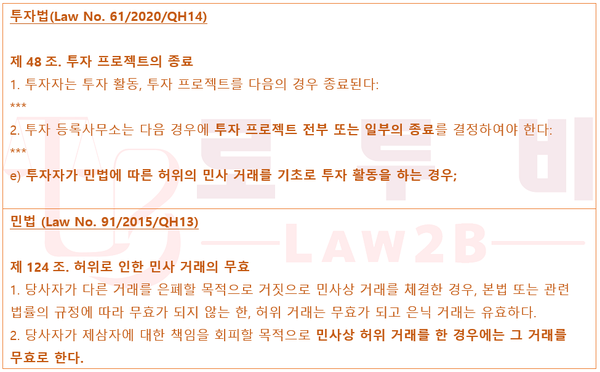 * 베트남 투자법 상에서도 베트남인을 통한 차명거래 등 민법상 허위거래에 해당하는 투자활동을 하는 경우에는 관계 당국이 해당 투자프로젝트의 일부 또는 전부를 종료시킬 수 있다.